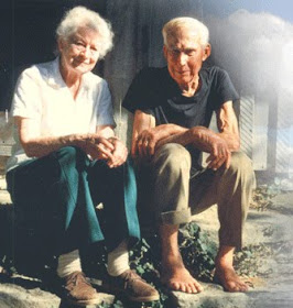 The Man:   Their names were Harlan and Anna.  A long time ago they came here, past the middle of their lives, to love until they were old.  They were refugees from that violent world of our ancestors that nearly destroyed itself.  They wanted a quiet place that was dark at night, unwanted by other people, where they could grow their food or catch or find it, and be warmed by firewood burning on a hearth they made of rocks carried up from the river or the creek.   Harlan, they say, made pictures of the river and the trees and little farms that stood along the valley sides.  And he and Anna made fine music in the evenings with his fiddle and her piano.  Up there is where their house was, and there the little shop where he made the pictures, and there the shed where they kept their goats.